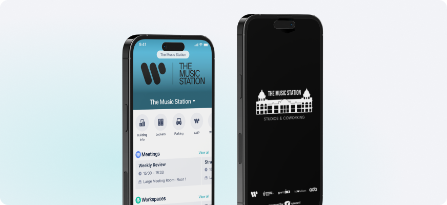 Implement a tool for booking desks, parking spots, meeting rooms, lockers, rehearsal rooms, studios, and other amenities with specific policies while enabling hybrid and flexible work via white-labeled "The Music Station" app